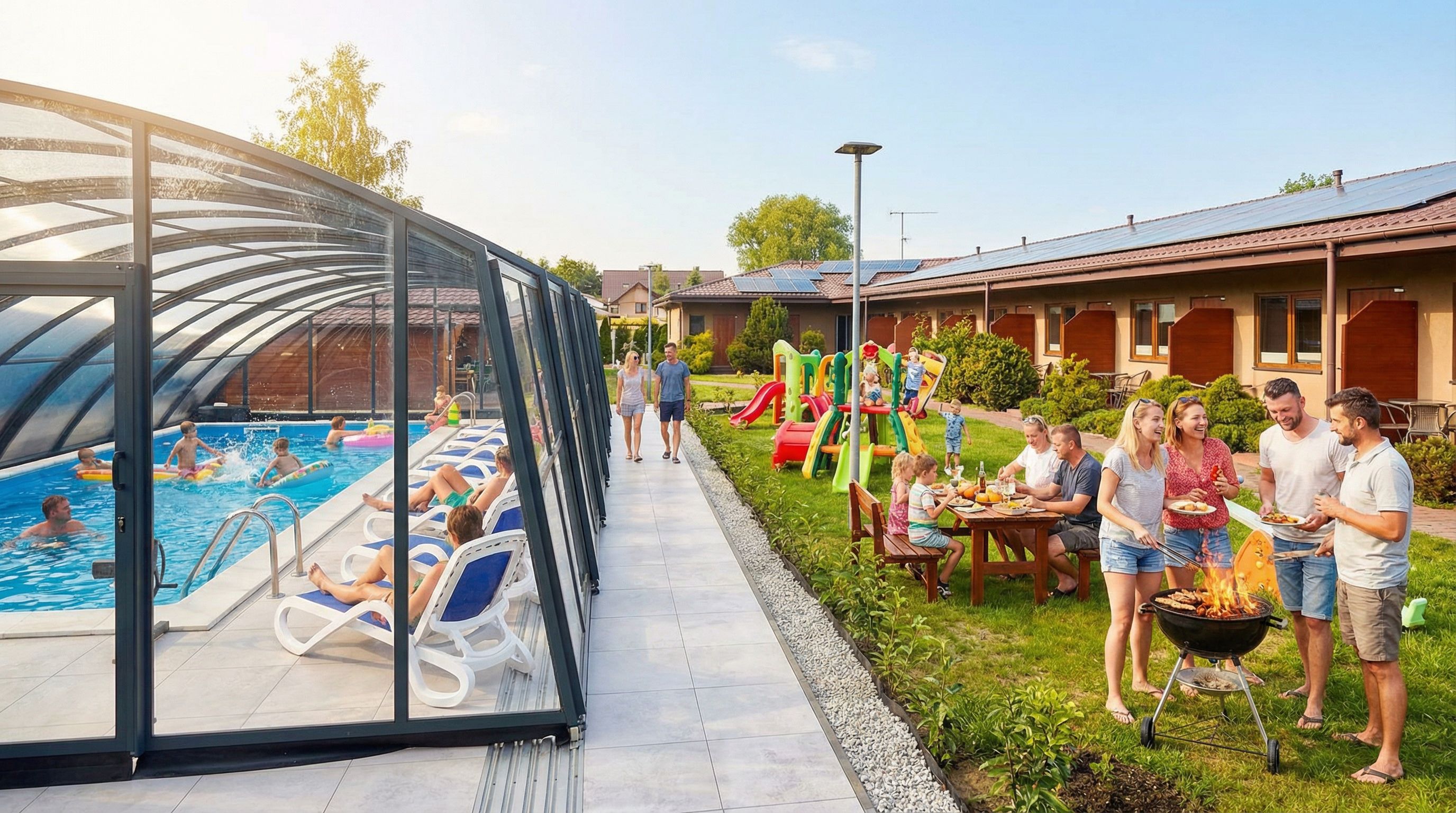 - Zadaszony basen z podgrzewaną wodą: Dostępny niezależnie od warunków pogodowych, gwarantuje komfortową kąpiel przez cały rok. To doskonała alternatywa dla Bałtyku w chłodniejsze dni oraz bezpieczne miejsce dla dzieci.